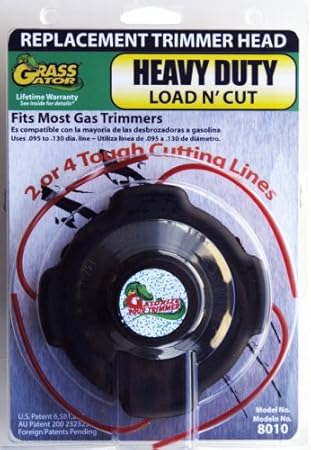 The Grass Gator Load n' Cut replacement trimmer head will fit 99% of all gas weed trimmers, including: Ryobi, John Deere, Echo, Stihl, Homelite, Bolens, Weedeater, Craftsman, Toro, Cub Cadet, Troy Bilt, Poulan, and most other makes. The Load n' Cut is designed for most gas weed trimmers, and is a great replacement for the standard bump & feed heads that are hard to load and difficult to use. The line installs into the Load n' Cut in seconds. Push the pre-cut line into the head and it automatically locks into place - ready to use. The Grass Gator Load n' Cut is excellent for both grass and weeds, and the tough, .130 diameter, line provides excellent service and longevity.